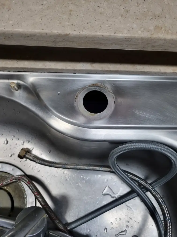 오래된 수전은 고정너트와 체결 플레이트가 내부 녹과 물때로 단단히 붙어 있습니다. WD-40 같은 침투제를 뿌린 뒤 잠시 기다리고, 전용 수전 렌치(베이슨 렌치)로 천천히 풀어냈습니다. 호스가 부러지지 않도록 한 손으로 호스를 잡고 다른 손으로 렌치를 돌려주는 것이 요령입니다. 수전을 제거하고 나니 상판 구멍 주변에 검은 곰팡이와 실리콘 잔여물이 남아 있어, 중성세제와 스펀지로 깨끗하게 닦고 필요 시 알코올로 마무리하여 완전히 건조시켰습니다. 이 과정이 제대로 이루어져야 새 수전이 단단히 밀착됩니다.