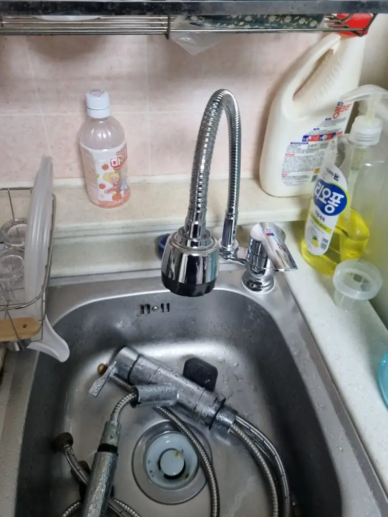 이번에는 절수 기능과 회전 스파우트, 분리형 샤워 헤드를 겸비한 고급형 싱크대 수전을 선택했습니다. 먼저 고정 플레이트와 패킹을 순서대로 끼운 뒤 수전을 상판 구멍에 넣고, 하부에서 손으로 위치를 잡아 고정너트를 조였습니다. 수평과 정면 각도가 맞는지 여러 번 확인한 뒤 렌치로 균일하게 힘을 주어 단단히 체결했습니다. 이어서 냉·온수 호스를 각각 배관에 연결하고, 누수 방지를 위해 테프론 테이프를 7~8바퀴 정도 감아주었습니다. 모든 연결이 끝난 후에는 호스가 꼬이지 않았는지, 벽과 간섭이 없는지 확인해야 합니다.